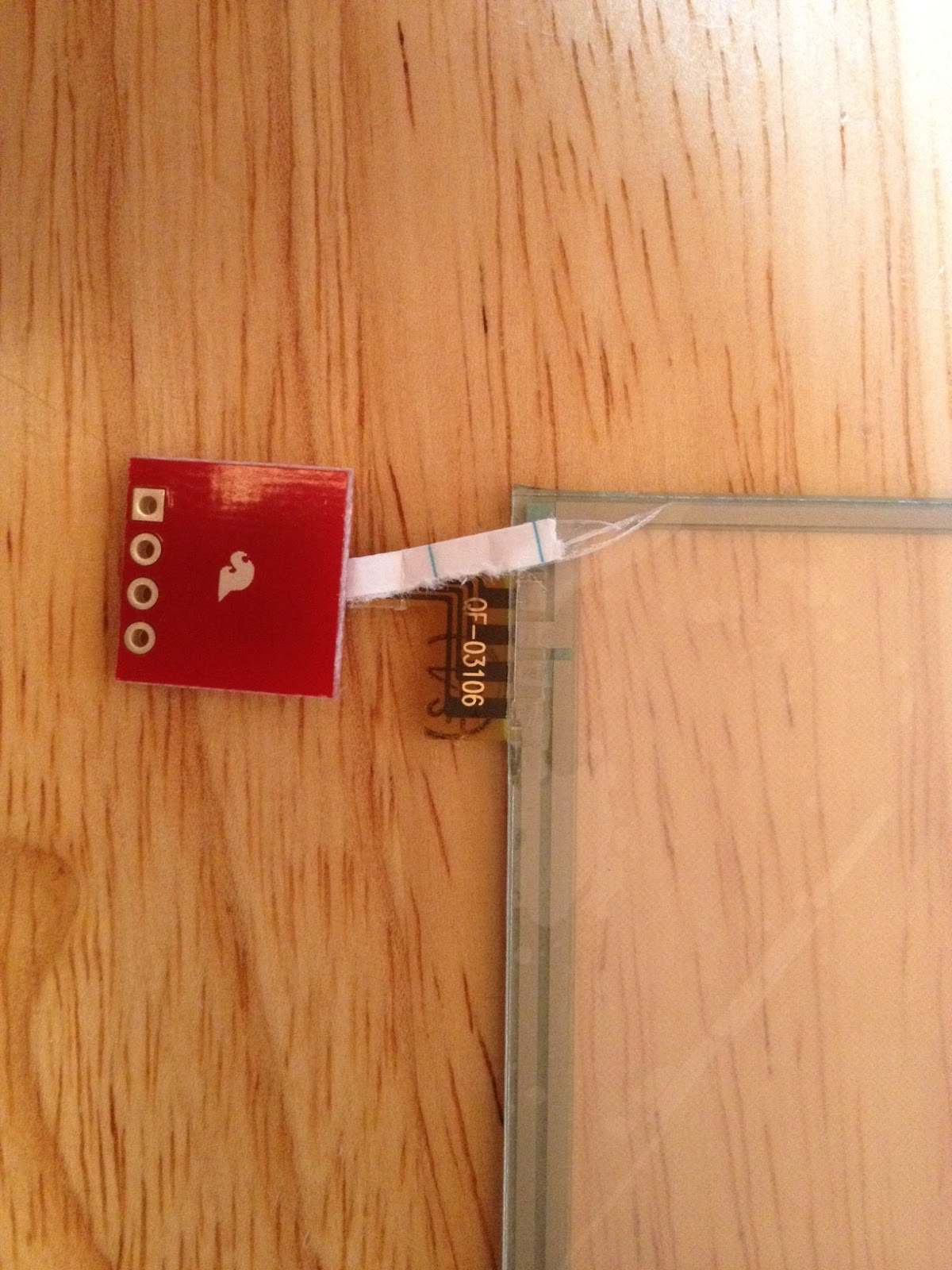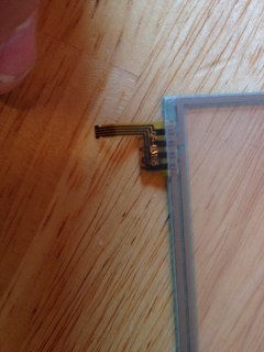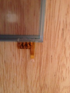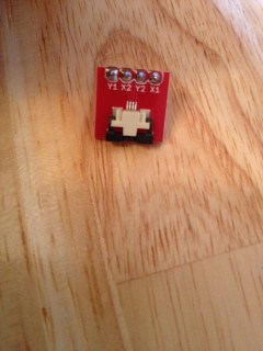 After that, I followed the bilder.org tutorial. I inserted the pins from the breakout board into the Arduino pins A0-A3; then copied the code from the bildr.org page; pasted the code into a new Arduino sketch; compiled and uploaded to the Arduino. Then I opened the Serial Monitor in Arduino flipped the board and touched the screen to see x/y coordinates scroll across the screen.