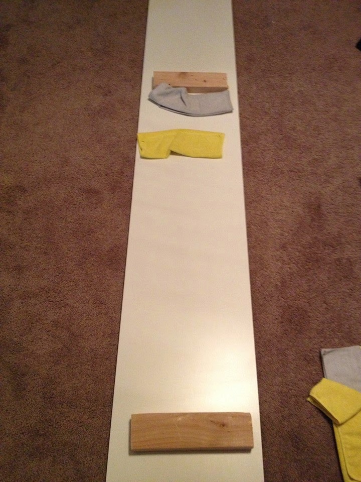 I took the melamine, cut my pieces of 2×4 and put them underneath the ends. I measured from the end about 7.5″ and drilled three holes through the shelf and into the wood blocks. I used 2.5″ flush wood screws (if you want to know the exact ones I can get those for you) that I purchased from a local hardware store (not Home Depot). I did the same thing at the other end. I flipped the board over and put the microfiber cloths down and started sliding.