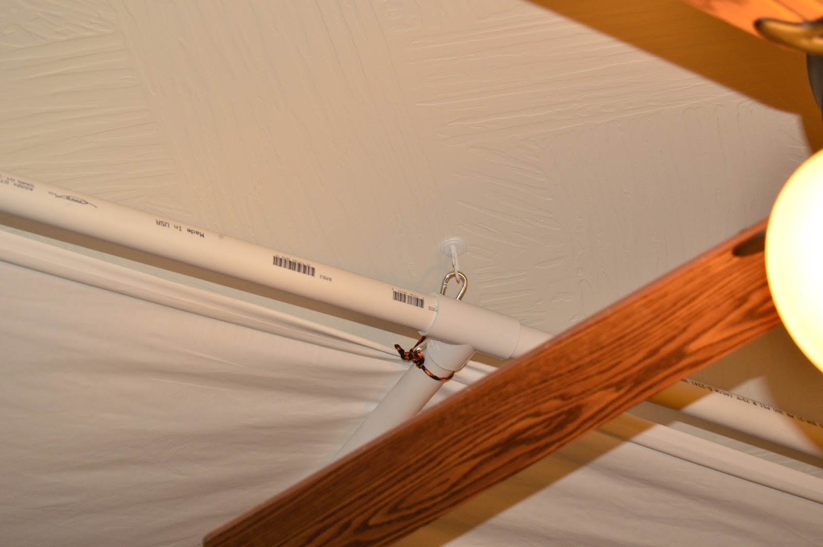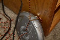 Closeups of the ceiling hooks and caribiners used to raise the temporary screen to the ceiling. I hold it down with a weight. The cord runs across the ceiling to a hook behind the screen anchor. When the screen is down and I unhook the cable I attach a tiny amount of weight to the caribiner and raise it to the ceiling then put a weight on the cable. The weight on the line allows the caribiner to come back down easily.