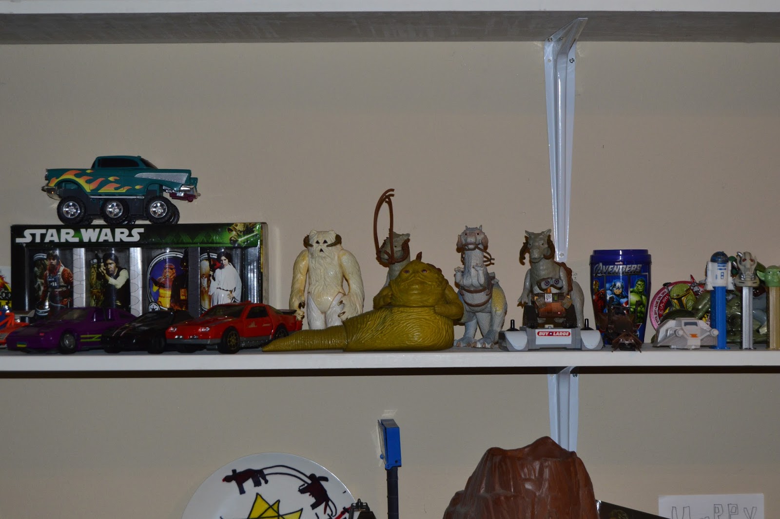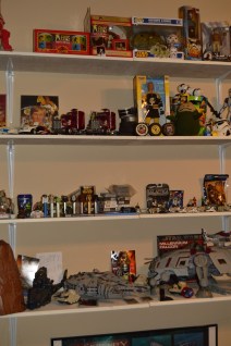 The entertainment portion and the consoles will go into a cabinet hidden from view. I’m not sure how I’m going to do that, yet either, but I’m drawing up ideas. I’ll draw up my ideas then figure out something practical and then I’ll build the room and put the stuff back. My daughter is anxious to organize all of the items by show/movie… until then there’ll just be this jumble on the shelving.