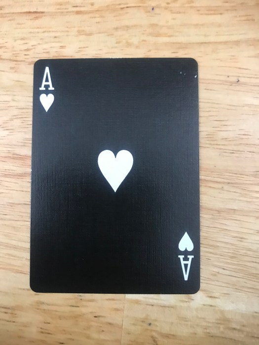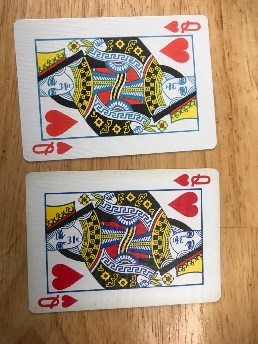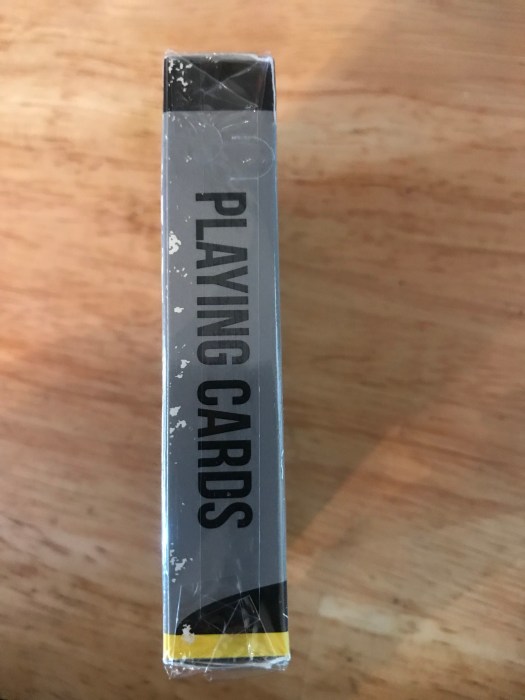 First, they are the same handling as all of the other NOCs I have received. The box has the comic look I’d expect including some stressed marks that make the box look fantastic. The jokers are purple and green like another Joker we know. The pips and design of the faces aren’t different than the other NOCs I own. I show a comparison with a well-used yellow set and then a close up of the QH. The other NOCs I have come with a dupe QH. This came with an inverse AH and a black card. These look and feel great! Well done!