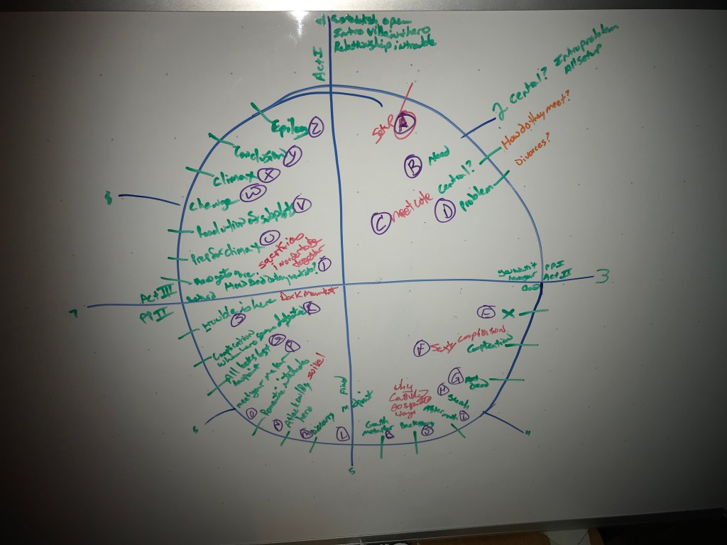 At this point, I usually break out my post-it notes and white board and scribble out some simple ideas that have come to mind while brainstorming. I have set ways I outline my stories. I have a story circle outline, my act 1 sequence setup (how act 1 brings the audience in, and the overall story structure for the entire script.