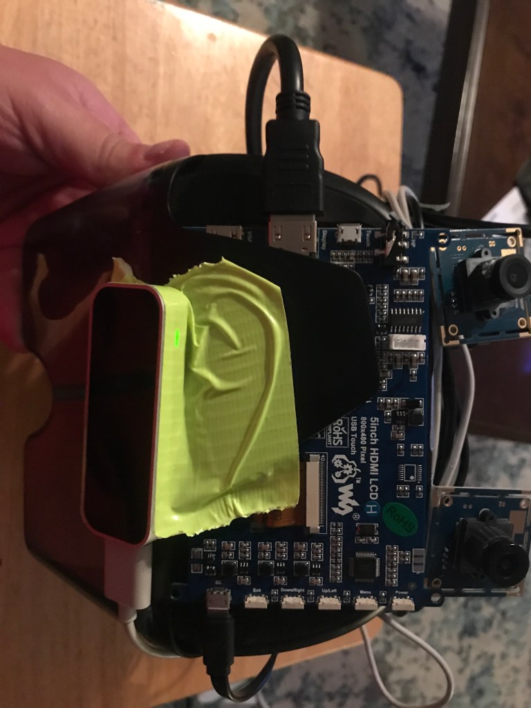 As it is the headset is quite heavy to wear. I’ve not weighed it, but it’s noticeably heavy. I mounted both RGB cameras like frog eyes. I have the IR cameras, but haven’t mounted them to the front yet. I hold them in place to test gaze tracking for now.