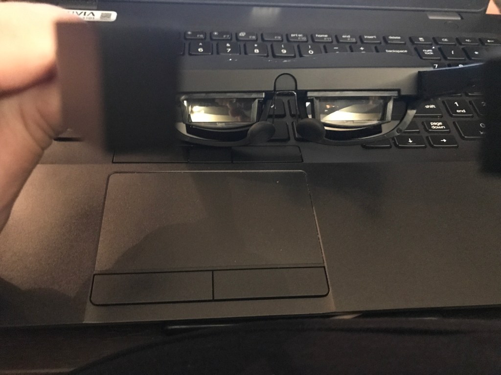 If you are nearsighted like I am you’ll have to either wear small-framed glasses, wear contacts, or get prescription inserts. They send you a sample to take to get prescription if you want them. I just wore my glasses under these. I have thin wire-framed glasses that weren’t uncomfortable. When I wear the Johnny Mnemonic I’d need corrective lenses on the other side of the viewscreen. The bonus is that you don’t need to split the screen. Working with the Johnny Mnemonic, North Star, HoloKit, Vufine AR, or others you need to split the screen so each eye has a representation. With this, you don’t notice that there are two screens. It looks like I’m looking at a TV not that far away. So I can utilize the whole screen.