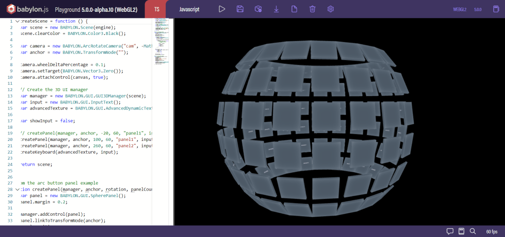Here are the elements that BabylonJS sold me on over ThreeJS. Export directly from Unity, Blender, 3DS Max, and more to a BabylonJS scene. 2D Canvas, HUD, GUI, 3D GUI, and more tools. The biggest selling point was the advanced playground and extensive examples in the documentation. Here’s an example of a scene I put together for SERINDA. I’m wiring it with my LeapMotion now so I can rotate it around and manage each panel. If you click Panel 11 or Panel 21 an input box will appear. If you click on the input box a virtual keyboard will show up and you can type in that box. The box and keyboard came from an example on the site and I modified a 3D scene to make the globe-like grid. I’m still manipulating a few things so it’s the way I want it, but this gives you a pretty good idea of how the playground works. ThreeJS has something like this as well.